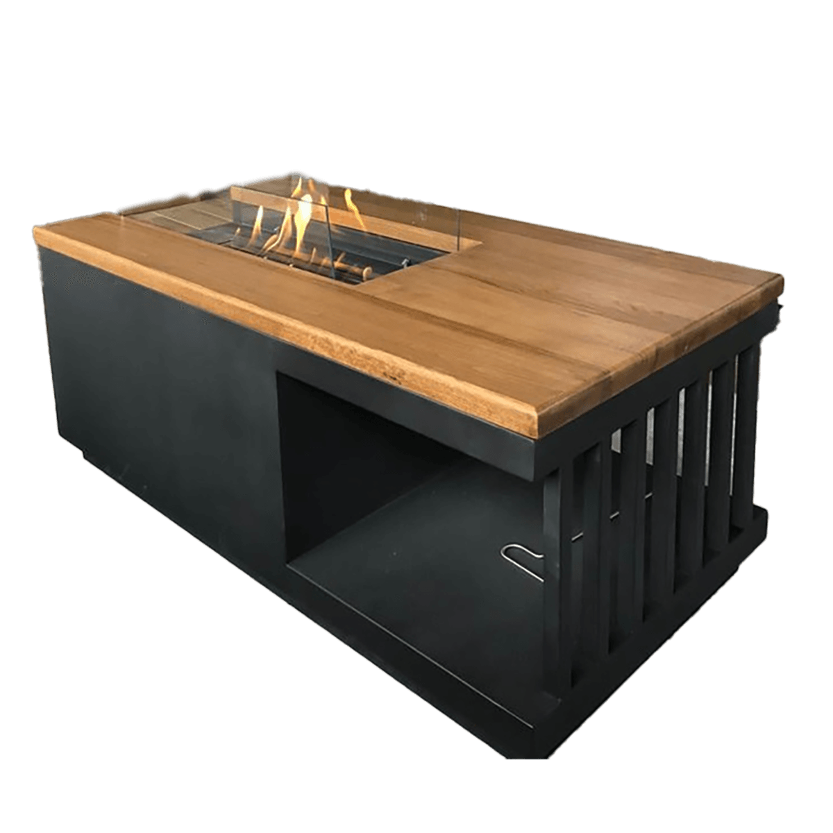 Αναβαθμίστε την ατμόσφαιρα του χώρου σας με αυτό το εντυπωσιακό προϊόν, ιδανικό για να προσθέσει ζεστασιά και στυλ. Διαθέτει μια κομψή ξύλινη επιφάνεια σε φυσικό τόνο, η οποία πλαισιώνει μια μοντέρνα εστία φωτιάς με γυάλινη προστασία, προσφέροντας ασφάλεια και ανεμπόδιστη θέα στις φλόγες. Η στιβαρή μεταλλική βάση σε σκούρο χρώμα προσδίδει σταθερότητα και βιομηχανικό χαρακτήρα, ενώ ο ανοιχτός αποθηκευτικός χώρος στο κάτω μέρος είναι ιδανικός για περιοδικά ή διακοσμητικά αντικείμενα. Μια τέλεια προσθήκη για σαλόνια, βεράντες ή οποιονδήποτε χώρο επιθυμείτε να δημιουργήσετε μια φιλόξενη και μοντέρνα ατμόσφαιρα.